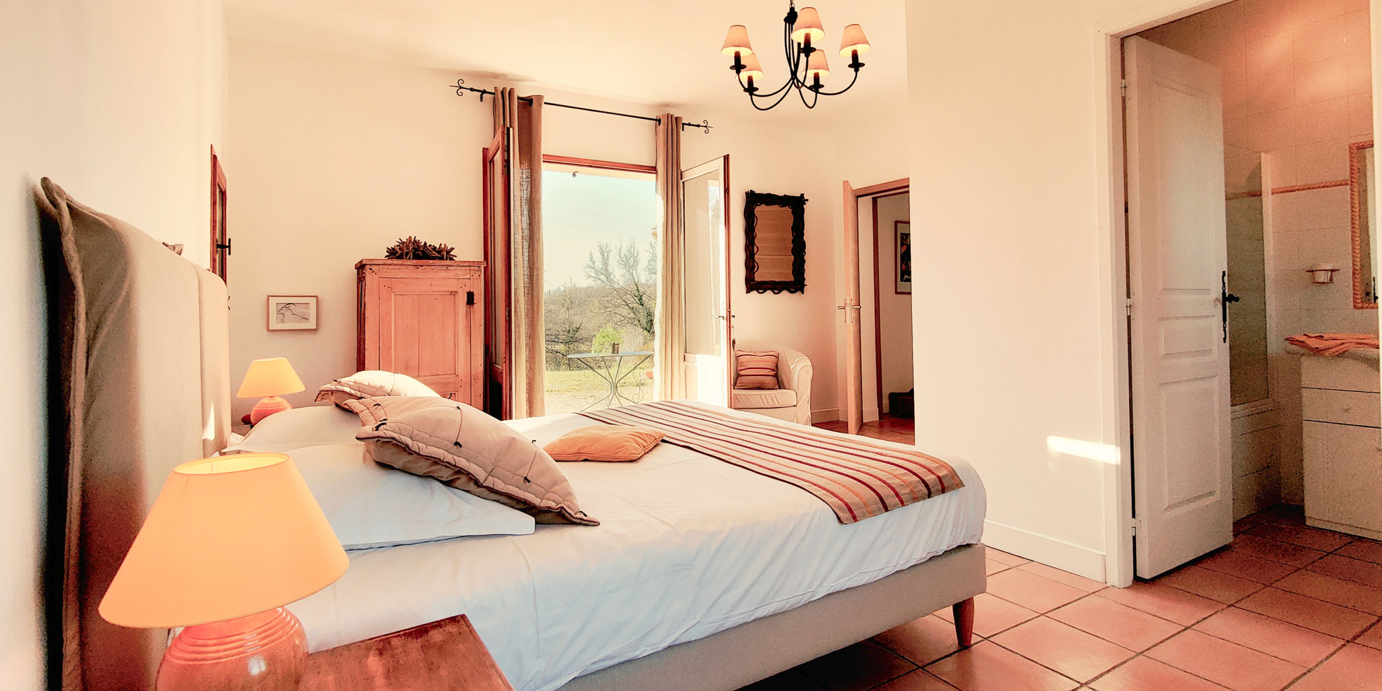 La chambre climatisée est pourvue d’une grande literie (180×200 ) ou à la demande de lits jumeaux. Elle dispose d’une salle de bain avec baignoire. Vous y trouverez également un plan vasque et des toilettes. Par ailleurs un sèche-cheveux, un étendoir rétractable et des produits de toilette sont à votre disposition.