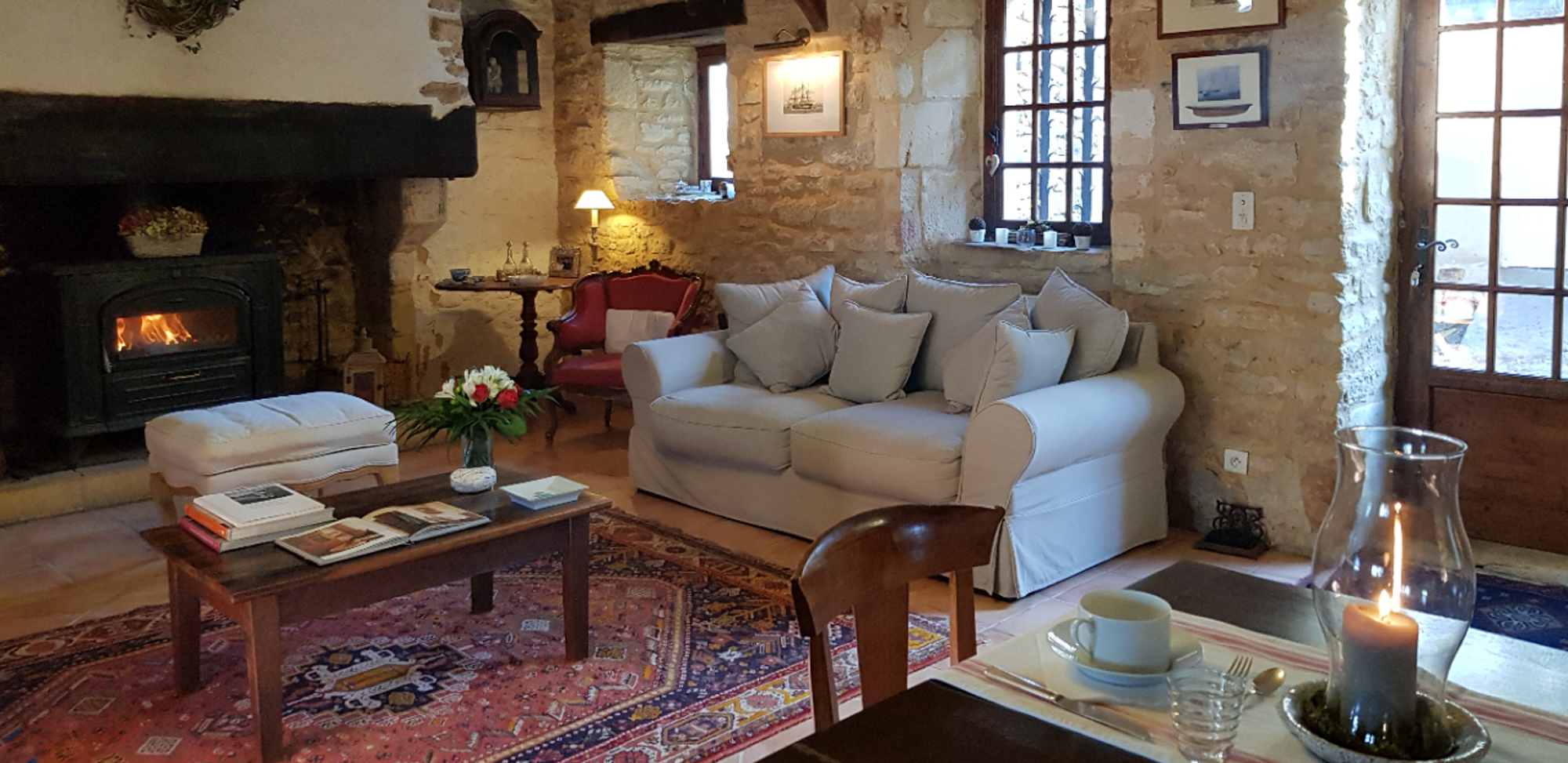 Lorsque les matinées sont un peu fraîches, nous vous recevons dans notre salon du XVII  siècle et sa cheminée d’époque et vous servons en table individuelle.